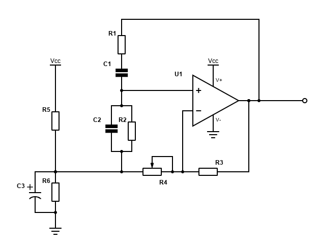 Avec \(R = R_1 = R_2\), \(C = C_1 = C_2\) qui forment le pont de Wien, \(R_3\) et \(R_4\) divisent le signal de sortie par 3 avant lde le réinjecter dans l'ampli; \(R_5\) et \(R_6\) créent une masse virtuelle (évitant la double alimentation de l'IC)